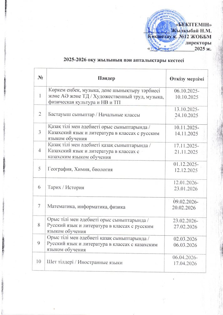 2025-2026 ОҚУ ЖЫЛЫНЫҢ ПӘН АПТАЛЫҚТАРЫ