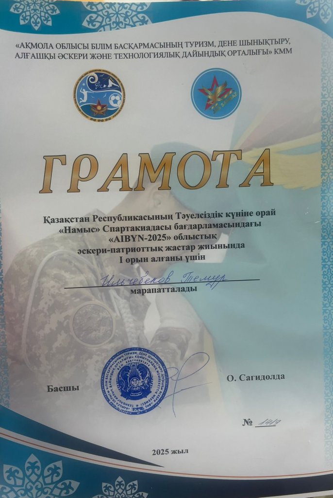 Қазақстан Республикасының Тәуелсіздік күніне орай өткен «Намыс» спартакиадасы аясындағы «AIBYN-2025» облыстық әскери-патриоттық жастар жиынында І орынды 9 "Б" сынып оқушысы Ильчебеков Тимур иеленді.