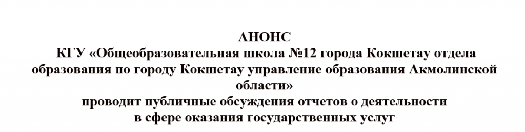 «Ақмола облысы білім басқармасының Көкшетау қаласы бойынша білім бөлімі Көкшетау қаласының №12 жалпы орта білім беретін мектебі» КММ «Мемлекеттік көрсетілетін қызметтер туралы» Қазақстан Республикасының Заңына сәйкес мемлекеттік қызметтер көрсету сапасын арттыру мақсатында 2025 жыл бойынша мемлекеттік қызметтер көрсету саласындағы қызметі туралы есепті мүдделі жеке және заңды тұлғалардың қатысуымен жария талқылау өткізеді.