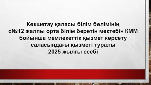 Көкшетау қаласы білім бөлімінің «№12 ЖОББМ» КММ бойынша мемлекеттік қызмет көрсету саласындағы қызметі туралы